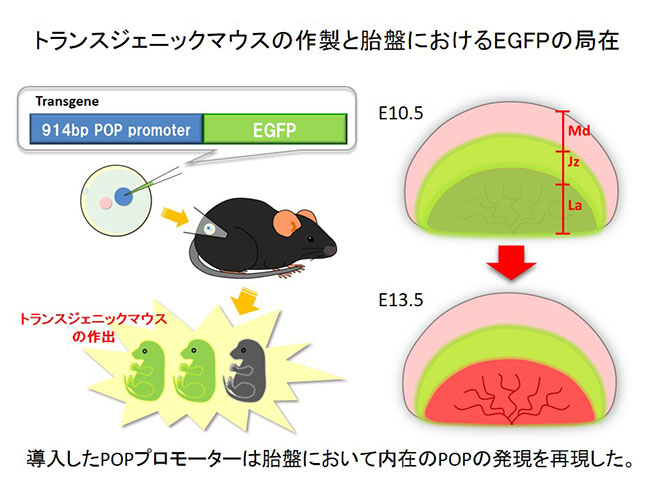 年 Matsubara S., Maruyama Y., and Kimura A.P. A 914-bp promoter is sufficient to reproduce the endogenous prolyl oligopeptidase gene localization in the mouse placenta if not subject to position effect Gene 524: 114-123 PubMed HUSCAP 我々はプロリルオリゴペプチダーゼ(prolyl oligopeptidase, POP)遺伝子の発現調節機構を解析している。今回はin vitroで十分に強い活性を持つことがわかっている914 bpのPOP遺伝子プロモーターがin vivoでどのような活性を示すのかについて、トランスジェニックマウスを作製、解析することによって調べた。まず、このプロモーター配列に緑色蛍光タンパク質(enhanced green fluorescent protein, EGFP)遺伝子をつなげたDNAコンストラクトを作製し、マウス受精卵の核に注入した。この卵から得られたマウスを調べたところ、注入したコンストラクトがゲノム中の異なる位置に挿入されたマウスを6匹得ることに成功した。もしもEGFPが発現していればそのマウスの組織が緑色に光ることが予想されるので、これら6匹について緑色の蛍光を発するか調べたところ、2匹が全身緑色に光ることがわかった(Fig. 2)。このことは残りの4匹において導入したDNAコンストラクトが閉じたクロマチン領域に挿入されたことを示唆しており、したがって、用いた914bpのPOP遺伝子プロモーターにはクロマチンを開く活性がないことを示唆した。また、蛍光を発したマウスと蛍光を発しなかったマウスについて、それぞれ導入したDNAコンストラクト中のPOP遺伝子プロモーターにおけるDNAメチル化を調べたところ、蛍光を発しなかったマウスにおいてのみ高いレベルのDNAメチル化が検出された(Fig. 3)。このことは蛍光を発しなかったマウスにおいて、導入したPOP遺伝子プロモーターがエピジェネティックなサイレンシングを受けていることを示してい る。次に蛍光を発したマウスにおいてEGFPの発現がPOPの発現と同じようなパターンを示すのか調べた。その結果、これら2匹のマウスでEGFPの組織分布はPOPと異なっており(Fig. 1)、卵巣においてもPOPと異なる発現局在を示した(Fig. 4)。一方、胎盤においてはこれら2匹のマウスの両方でEGFP蛍光がPOPと同じような変化を示すことがわかった(Fig. 5)。つまり、E10.5-E12.5の時期ではJzとLaと呼ばれる領域が緑色の蛍光を発し、E13.5以降ではJzのみが蛍光を発した。このことは用いた914bpのPOP遺伝子プロモーターが位置効果を受けない場合に、胎盤におけるPOP遺伝子の発現を十分に活性化できることを示している。また、今回の解析ではこの胎盤におけるPOP遺伝子の活性化にAP-2gammaと呼ばれる胎盤特異的な転写因子が関与する可能性も示した (Fig. 6)。 ![]() |