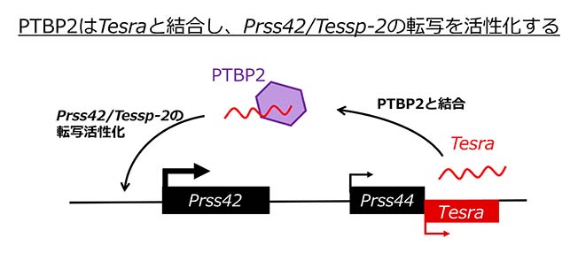 | 2024年 Sato J., Satoh Y., Yamamoto T., Watanabe T., Matsubara S., Satake H., and Kimura A.P. PTBP2 binds to a testis-specific long noncoding RNA, Tesra, and activates transcription of the Prss42/Tessp-2 gene Gene 893: 147907 PubMed 精巣では非常に多くの種類の長鎖非コードRNA(long noncoding RNA, lncRNA)が発現しています。しかし、個別のlncRNAの機能、特に転写制御に関わる分子メカニズムに関して行われた解析はごくわずかでした。我々のグループでは、精巣特異的なlncRNAとしてTesraを同定し、Tesraが減数分裂に重要な遺伝子であるPrss42/Tessp-2遺伝子の転写活性化に寄与することを明らかにしました(Satoh et al., 2019)。本研究では、TesraによるPrss42/Tessp-2転写活性化の詳細な分子メカニズムの解明を目指しました。通常、lncRNAは何らかのRNA結合タンパク質(RNA binding protein, RBP)と結合して機能します。そこで最初に、Ribotrap法と質量分析法によってTesraと結合するRBPの候補を複数同定しました(Fig. 1)。その中でも強いスコアを示したPTBP2(polypyrimidine tract binding protein 2)に関して、精巣の発生段階別RNA-seqデータセットとqRT-PCRを用いた発現解析をおこなったところ、精子形成過程におけるPtbp2 mRNAの発現パターンがTesraやPrss42/Tessp-2と相関することがわかりました(Fig. 2)。さらに、RNA免疫沈降法によってPTBP2とTesraが精巣生殖細胞の核で実際に結合していることも確かめました(Fig. 3)。PTBP2タンパク質はTesraやPrss42/Tessp-2が発現する一次精母細胞に局在することがわかっていたため、私たちはPTBP2がTesraによるPrss42/Tessp-2の転写活性化に寄与する可能性があると考えました。そこで、Doxycycline(Dox)という薬剤依存的にTesraを転写誘導することでPrss42/Tessp-2のプロモーター活性を制御する細胞培養実験系を作り、検証を行いました(Fig. 4A)。この系では、Dox添加によってTesraの発現が誘導され、それによりPrss42/Tessp-2プロモーター活性が上昇しました(Fig. 4B,C)。そこでこの系においてPtbp2の発現をノックダウンしたところ、TesraによるPrss42/Tessp-2プロモーター活性の上昇が有意に低下することがわかりました(Fig. 5)。以上の結果から、PTBP2は一次精母細胞でTesraと結合して、TesraとともにPrss42/Tessp-2遺伝子の転写活性化に機能すると考えられます。本研究はこれまで報告が少ない精巣におけるlncRNA作用の分子メカニズムの一端を明らかにした貴重な一例となります。 ![]() |