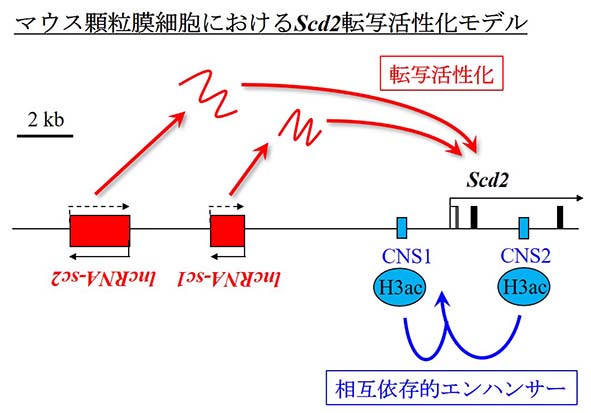 | 2020年 Mayama S., Hamazaki N., Maruyama Y., Matsubara S., and Kimura A.P. Transcriptional activation of the mouse Scd2 gene by interdependent enhancers and long noncoding RNAs in ovarian granulosa cells Journal of Reproduction and Development 66: 435-444 PubMed 我々はこれまでマウス卵巣の顆粒膜細胞における転写調節メカニズムを解析しており、エンハンサーとlong noncoding RNA(lncRNA)が重要であることを明らかにしてきました(Matsubara et al., 2010; Matsubara et al., 2014; Kimura et al., 2017)。今回はこのことをさらに別な遺伝子(Scd2) で検証しました。マウスScd2遺伝子は脂質代謝に機能する遺伝子で、卵巣と脳で高発現を示し、卵巣では顆粒膜細胞で特異的な発現を示しました(Fig. 1)。ヒトとマウスのゲノム配列を比較したところ、マウスScd2遺伝子座には4つのConserved Noncoding Sequence(CNS)が存在することが判明しました(Fig. 2)。また、これらのCNSを含むさまざまなゲノム領域をRT-PCR解析した結果、CNSとは別の2か所のScd2上流配列がScd2発現と相関して転写されていることがわかりました(Fig. 3)。これら上流領域の転写産物はlncRNAであるため、それぞれをlncRNA-sc1とlncRNA-sc2と名づけて、さらに解析を行いました。その結果、lncRNA-sc1とlncRNA-sc2はいずれも顆粒膜細胞の核に局在し(Fig. 3D)、顆粒膜細胞の初代培養系でノックダウンするといずれもScd2発現の低下を引き起こしました(Fig. 4)。これらのことから、2つのlncRNAはともに顆粒膜細胞でScd2の転写活性化に関わることが考えられます。一方、クロマチン免疫沈降法でヒストンH3K9/K27アセチル化レベルを調べたところ、4つのCNSのうちCNS1とCNS2で顆粒膜細胞特異的なピークが検出されました(Fig. 5)。さらに、顆粒膜細胞の初代培養系におけるレポーター解析では、CNS1とCNS2が両方存在している時にそれぞれエンハンサー活性を示しました(Fig. 6)。以上のことから、マウスScd2は顆粒膜細胞において、2つのlncRNAと相互依存的な2つのエンハンサーによって転写活性化されることが示唆されます(Fig. 7)。 ![]() |